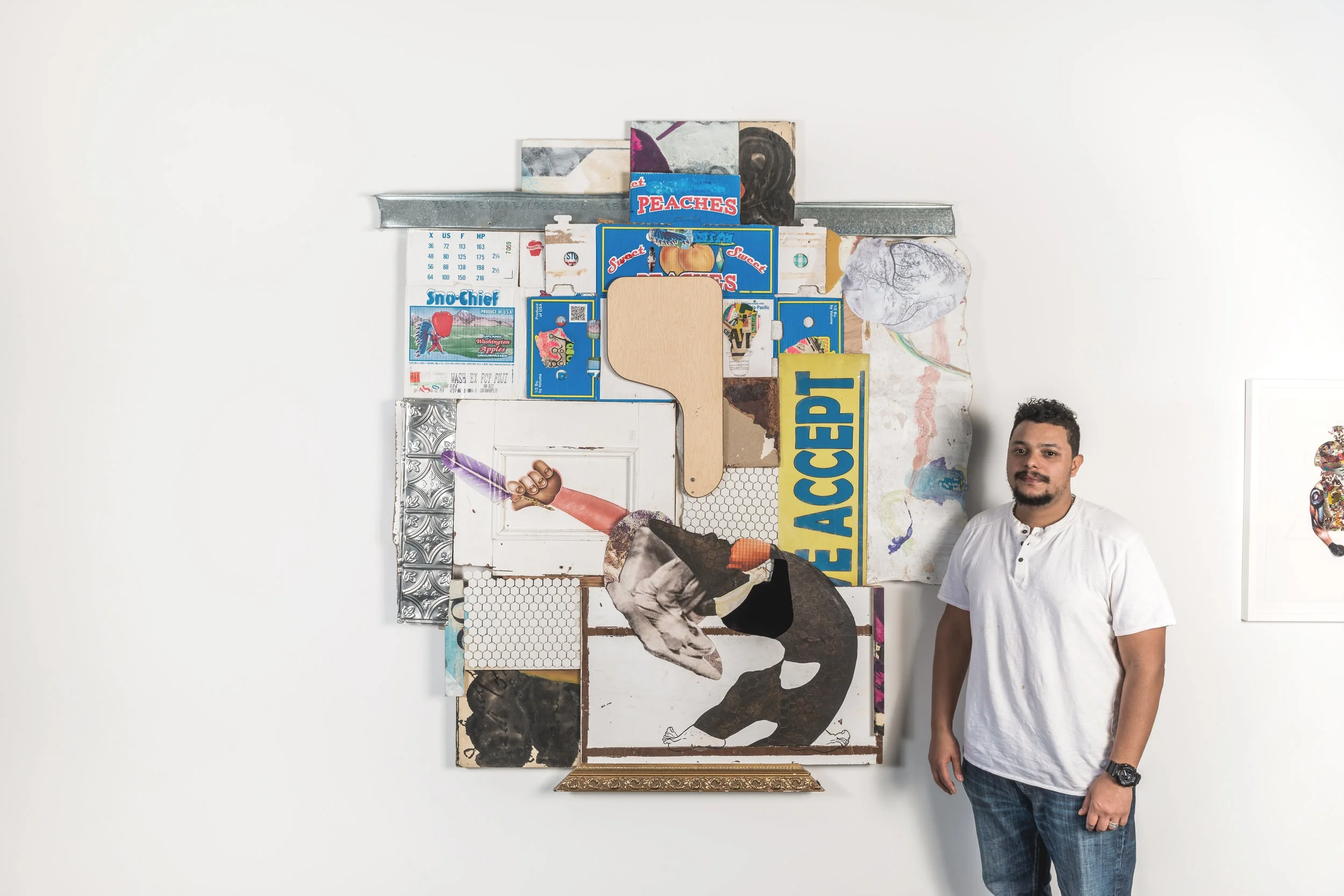 David Shrobe pushed his affinity for painting and materials to produce a body of work with open-ended stories alluding to the artist’s ongoing exploration of the world around him, domestically and historically, on narrow sidewalks and within his vast imagination. Appropriating imagery from multiple sources and surveying his neighborhood for discarded items, David extracted that which is precious from explicitly pedestrian matter. Throughout the exhibition, the artist rejected stereotypical context clues to elevate the subjects of each portrait to an uncharted and remote locale. The title of the show, Meta-Modes, speaks to David’s multi-layered approach to constructing an image. Incorporating the term ‘meta’ in the title also evokes the metaphysical nature of this work which is underscored by David’s interests in science fiction, African mythology, and Zen Buddhism; further emphasizing this artist’s exploration of the universe and where we fit within it. Meta-Modes: New Work by David Shrobe was curated by Lauren Kelley, Associate Director of Curatorial Programs.